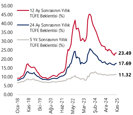 TCMB’nin Kasım 2025 dönemine ilişkin Piyasa Katılımcıları Anketi yayınlandı. Katılımcıların 2025 yıl sonu TÜFE beklentisi kasım ayında %31,8’den %32,2’ye 2026 yıl sonu TÜFE beklentisi ise %22,1’den %23,2 seviyesine yükseldi. Ek olarak, piyasa katılımcılarının 12 ay sonrası TÜFE beklentisi %23,3’ten %23,5’e, 24 ay sonrası TÜFE beklentisi ise %17,4’ten %17,7’ye çıktı. 5 yıl sonrasına ilişkin yıllık TÜFE beklentisi ise %11,4 seviyesinden %11,3’e indi.
