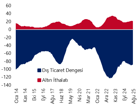 Aylık altın ithalatı ağustos ayında 943 milyon dolardan 1,1 milyar dolara sınırlı bir artış gösterirken, yılın ilk sekiz ayındaki kümülatif altın ithalatı 13,3 milyar dolar seviyesinde gerçekleşti. 12 aylık dönemde ise altın ithalatı 20,5 milyar dolardan 20,3 milyar dolara indi.