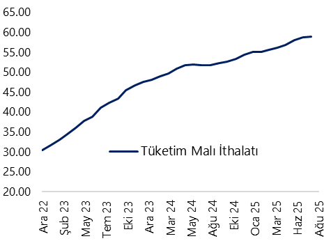 Tüketim malı ithalatı ağustosta 5,3 milyar dolardan 4,3 milyar dolara gerilerken, yıllık tüketim malı ithalatı ise bu dönemde 58,8 milyar dolardan 59 milyar dolara çıktı. İç talebe yönelik önemli göstergelerin başında gelen dayanıklı tüketim malı ithalatı ağustos ayında aylık bazda %21 gerileme kaydederek 527 milyon dolara inerken, binek otomobil ithalatı ise 2 milyar dolardan 1,6 milyar dolara indi. Ağustosta tüketim malı ithalatında görülen geri çekilme ve dayanıklı tüketim malı ithalatındaki düşüş, iç talep dinamiklerinde yavaşlama sinyali veriyor.
