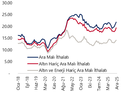 Dış ticaret verileri, sanayi üretimi tahminlerimiz açısından da yol gösterici nitelikte. Aralık verilerinde altın ve enerji harici ara malı ithalatı aylık bazda %14, yıllık bazda ise %14,8 artış kaydetti. Sanayi üretimine ilişkin diğer bir önemli öncü gösterge olan İstanbul Sanayi Odası (İSO) Türkiye İmalat PMI ise aralık ayında 48 seviyesinden 48,9’a çıkarak son bir yılın en yüksek düzeyine ulaştı. Öncü sinyaller doğrultusunda sanayi üretiminin yılın son ayında toparlanma eğilimini sürdürmesini bekliyoruz.
