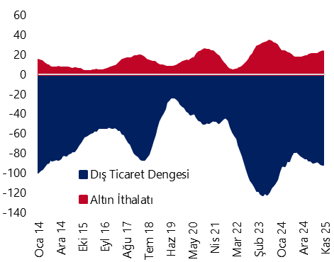 Aylık altın ithalatı kasım ayında, ekim ayındaki 2,8 milyar dolar seviyesinden 2,5 milyar dolara inerken, yılın ilk onbir ayındaki kümülatif altın ithalatı 21,1 milyar dolar seviyesinde gerçekleşti. 12 aylık altın ithalatı ise kasımda 22,7 milyar dolardan 23,1 milyar dolara çıktı.
