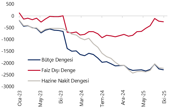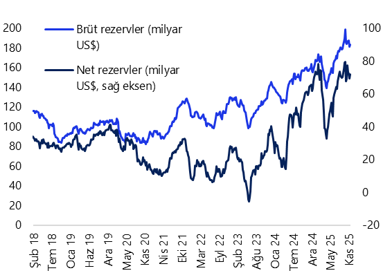 - Hazine nakit dengesi kasım ayında 56,4 milyar TL fazla verirken, faiz dışı denge ise 173,9 milyar TL fazla kaydetti. Hazine nakit dengesi verileri, 15 Aralık Pazartesi günü açıklanacak olan merkezi yönetim bütçe verileri için öncü niteliğinde. Hazine nakit dengesi verileri çerçevesinde, merkezi yönetim bütçesinin kasım ayında 38 milyar TL civarında bir fazla verebileceğini hesaplıyoruz. 2025 yıl sonu bütçe açığı tahminimiz 2,3 trilyon TL (GSYİH’nın %3,7s’i) düzeyinde. Hatırlanacağı üzere 2026 – 2028 yıllarına ilişkin açıklanan Orta Vadeli Programda (OVP) 2025 bütçe açığı / GSYİH oranı %3,1 seviyesinden %3,6 seviyesine, 2026 yılı için ise söz konusu oran %2,8’den %3,5’e revize edilmişti.