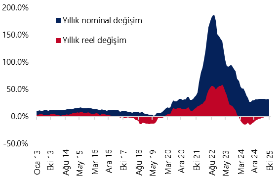 - Konut Fiyat Endeksi (KFE) ekimde aylık %1,6 ve yıllık %31,6 oranında artış kaydederek 198,8 olurken, fiyatlarda reel bazda ise yıllık %1 düşüş kaydedildi. Konut fiyatlarında yıllık bazdaki reel değer kaybı Şubat 2024’ten bu yana aralıksız devam ederken, kaybın giderek azaldığı ve son beş ayda yıllık reel kaybın %1 - %1,5 bandına oturduğu takip ediliyor. Verinin detayını incelediğimizde, ekim ayında konut fiyatları İstanbul’da aylık bazda %2,7, Ankara’da %1 ve İzmir’de %1,8 oranında artarken, bu illerdeki yıllık artışlar ise sırasıyla %32,4, %38,4 ve %30,7 oldu. Yıllık konut fiyat artışlarının en yüksek olduğu bölge %38,4 ile Ankara olurken, en düşük yıllık artış ise %23,1 ile Aydın, Denizli ve Muğla bölgesinde kaydedildi. Kredi faizlerindeki görünüme de bakacak olursak: Eylül ayında ortalama %38,8 olan konut kredi faizi, ekimde ise %37,9 seviyesine geriledi. Konut kredi faizi Ekim 2024 ‘te ise %41,5 seviyesindeydi. Bu görünüm, konut fiyatlarında reel taraftaki zayıf seyrin sona erme eğilimine girdiğine ve reel yıllık değişimin önümüzdeki dönemde pozitif bölgeye yaklaşabileceğine işaret ediyor.