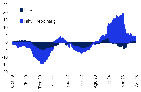 - Yabancı yatırımcılar, 28 Kasım – 5 Aralık haftasında hisse senedi piyasasında 154,3 milyon dolar alım yaparken, tahvil piyasasında ise repo işlemleri hariç 23,7 milyon dolarlık sınırlı bir satış gerçekleştirdi. Böylelikle tahvil piyasasında üst üste beş haftadır devam eden yabancı alım serisi kesintiye uğradı. Hatırlanacağı üzere yabancı yatırımcılar kasım ayı boyunca repo hariç tahvil piyasasında toplam 2 milyar dolarlık alım yapmış, bu dönemde yabancıların tahvil stoku içindeki payı mart ayından bu yana ilk kez %7 eşiğini aşmıştı. Aralık ayına tahvil tarafında sınırlı bir yabancı satışıyla başlanmış olsa da, önümüzdeki dönemde yabancı talebinin devam edip etmeyeceği, faiz patikasına ilişkin algı ve standart portföy kanallarına yönelik talep açısından belirleyici olacak. Bu dönemde, yurt içi yerleşiklerin altın hariç parite etkisinden arındırılmış DTH’ları, kurumların satışı öncülüğünde 2,6 milyar dolarlık sert bir düşüş kaydetti. 28 Kasım – 5 Aralık haftasında TCMB net döviz rezervi 5,4 milyar dolar yükselişle 77,4 milyar dolar, brüt döviz rezervi ise 3,2 milyar dolar artışla 186,5 milyar dolar oldu. Swap stoku bu dönemde 1,1 milyar dolar artarak 15,5 milyar dolara çıkarken, swap hariç net rezerv ise 4,3 milyar dolar yükselerek 61,9 milyar dolar oldu. Ayrıntılı rapor için tıklayınız.
