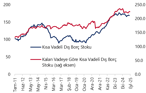 - Kısa vadeli dış borç stoku eylül ayında aylık bazda %1,9 gerileyerek 165,8 milyar dolar olarak gerçekleşti. Kısa vadeli dış borç verilerinde özellikle “kalan vadeye göre kısa vadeli dış borç stoku” verisini, diğer bir deyişle orijinal vadesine bakılmaksızın vadesine 1 yıl ve daha kısa kalan dış borçları yakından takip ediyoruz. Söz konusu borç stoku Eylül 2025 itibariyle 224,8 milyar dolar seviyesinde oluşmuş durumda. Bu veriden, Türkiye’de yerleşik bankaların ve özel sektörün yurt dışı şubeleri ile iştiraklere olan borçlarını (26,9 milyar TL) çıkararak baktığımızda, borç stokunun 197,9 milyar dolar olduğu görülüyor. Bu veriye önümüzdeki 12 aylık cari açık beklentisini de ekliyoruz ve böylelikle Türkiye’nin önümüzdeki 1 yıllık süreçteki dış finansman ihtiyacını Temmuz 2025 itibariyle yaklaşık olarak 223 milyar dolar civarında hesaplıyoruz.