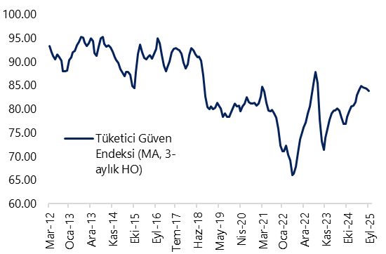 - Tüketici güven endeksi kasım ayında 83,6 seviyesinden 85’e yükselirken, 3 aylık ortalamada ise endeks seviyesi 83,9’dan 84,2’ye çıktı. Kasım verisinin alt kalemlerine baktığımızda; Mevcut dönemde hanenin maddi durumuna ilişkin endeks 67,7’den 69,6’ya, gelecek 12 aylık dönemde hanenin maddi durum beklentisine ilişkin alt endeks 84,2’den 85,7’ye, gelecek 12 aylık dönemde genel ekonomik durum beklentisi endeksi 78,6’dan 79,6’ya ve iç talep görünümüne yönelik önemli bir kalem olan gelecek 12 aylık dönemde dayanıklı tüketim mallarına harcama yapma düşüncesi endeksi ise 104 seviyesinden 105’e çıktı. Nisan ayından bu yana 84 – 85 bandında görece yatay bir seyir izleyen ve 100 eşik değerin altında yer almakta olan tüketici güven endeksi, tüketici güvenindeki kötümser durumun devam ettiğine işaret ediyor.