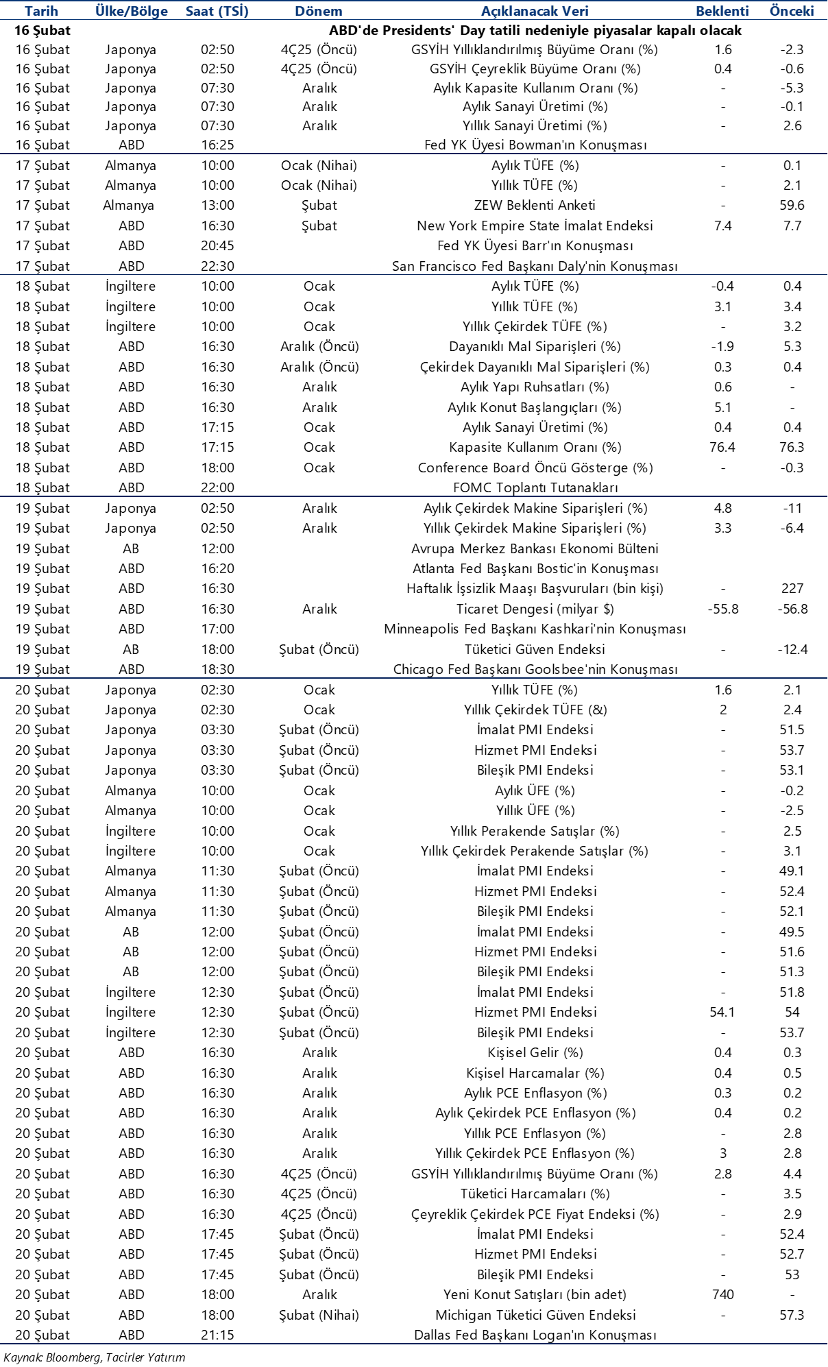 Ekonomik Veri Takvimi 16 – 20 Şubat