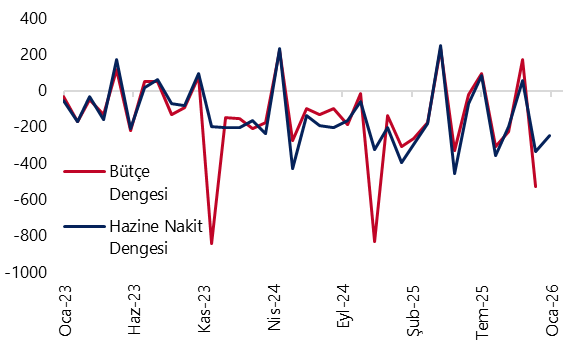 - Hazine nakit dengesi ocakta 246,2 milyar TL açık verirken, faiz dışı denge ise 207,5 milyar TL fazla kaydetti. Ocak ayı Hazine nakit dengesi verileri, 16 Şubat Pazartesi günü açıklanacak olan merkezi yönetim bütçe verileri için öncü niteliğinde. Bu çerçevede, merkezi yönetim bütçe dengesinin ocak ayında 165 milyar TL civarında açık verebileceğini tahmin ediyoruz. 2026 bütçe açığı tahminimiz 2,8 trilyon TL (GSYİH’nın %3,4’ü) seviyesinde bulunmakla birlikte, tahminimize yönelik risklerin aşağı yönlü olduğunu değerlendiriyoruz. Mevcut görünüm, mali duruşta yapısal bir sıkılaşmadan ziyade, harcama kompozisyonundaki geçici iyileşmelerin belirleyici olduğuna işaret ediyor. Bununla birlikte, cari harcamalar ile sermaye harcamalarının seyri, mali disiplinin kalıcılığı açısından önümüzdeki dönemde temel risk alanları olmayı sürdürüyor.