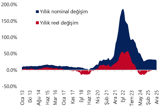 - Konut Fiyat Endeksi (KFE) aralık ayında aylık %0,2 ve yıllık %29 artışla 204,5 seviyesine yükselirken, yıllık bazda reel olarak %1,4 düşüş kaydetti. Hatırlanacağı üzere KFE, kasım ayında yıllık bazda reel %0,2 artışla Ocak 2024’ten bu yana ilk kez pozitif bölgeye geçmişti. Ancak aralık ayı itibarıyla reel yıllık değişimin yeniden negatif tarafa döndüğü ve bu gerilemenin son altı ayın en sert reel düşüşüne işaret ettiği görülüyor. 2025 son çeyreğinde konut talebinde izlediğimiz zayıflama dikkate alındığında, konut fiyatlarında reel artışın kısa vadede zayıf bir seyir izlemeye devam etmesini bekliyoruz.