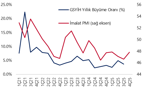 - Türkiye ekonomisinin 2025 yılının son çeyreğinde yıllık bazda yaklaşık %4 büyüme kaydetmesini bekliyoruz. Bununla birlikte, tahminimize yönelik risklerin aşağı yönlü olduğunu değerlendiriyoruz. Beklentilerimizle uyumlu bir gerçekleşme, 2025 yılı büyümesinin %3,8 seviyesinde oluşmasına işaret ederken; daha zayıf bir performans halinde yıl geneli büyümesinin %3,6–%3,7 bandında kalması mümkün görünüyor.2026 yılına ilişkin büyüme tahminimizi ise %4 seviyesinde koruyoruz.