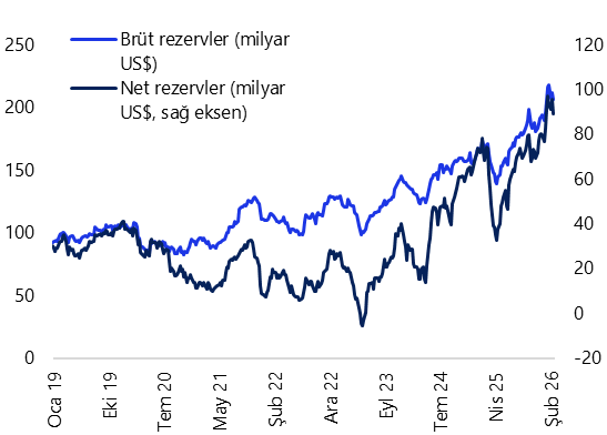 - 6 Mart Cuma günü açıklanacak olan şubat ayı Hazine nakit dengesi verileri, 16 Mart Pazartesi günü açıklanacak olan merkezi yönetim bütçe verileri için öncü niteliğinde. 2026 bütçe açığı tahminimiz 2,8 trilyon TL (GSYİH’nın %3,4’ü) seviyesinde bulunmakla birlikte, tahminimize yönelik risklerin aşağı yönlü olduğunu değerlendiriyoruz. Mevcut görünüm, mali duruşta yapısal bir sıkılaşmadan ziyade, harcama kompozisyonundaki geçici iyileşmelerin belirleyici olduğuna işaret ediyor. Bununla birlikte, cari harcamalar ile sermaye harcamalarının seyri, mali disiplinin kalıcılığı açısından önümüzdeki dönemde temel risk alanları olmayı sürdürüyor.