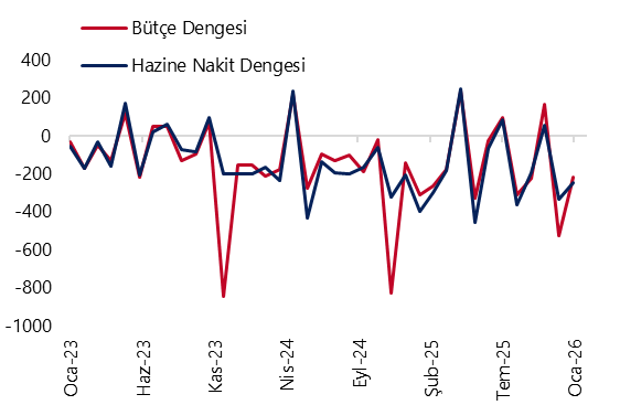 - Merkezi yönetim bütçesi ocak ayında 214,5 milyar TL açık verirken, faiz dışı denge ise 241,8 milyar TL fazla kaydetti. Böylelikle 12 aylık kümülatif bütçe açığı 1,8 trilyon TL’den 1,87 trilyon TL’ye sınırlı bir artış kaydederken, faiz dışı fazla ise 255,3 milyar TL’den 473,4 milyar TL’ye çıktı. Hazine nakit dengesi ocakta 246,2 milyar TL açık verirken, faiz dışı denge ise 207,5 milyar TL fazla kaydetmişti. Dolayısı ile bütçe açığının yılın ilk ayında nakit açığına göre yaklaşık 32 milyar daha düşük gerçekleştiği ve tahakkuk bazlı bütçe ile nakit bazlı bütçe arasındaki ayrışmanın, azalarak da olsa devam ettiği izleniyor. Bu görünüm, yılın ilk ayında faiz dışı performansın görece güçlü seyrettiğine işaret etmekle birlikte, mali disiplinin sürdürülebilirliği açısından önümüzdeki dönemde harcama dinamiklerinin yakından izlenmesi gerektiğini gösteriyor.