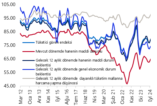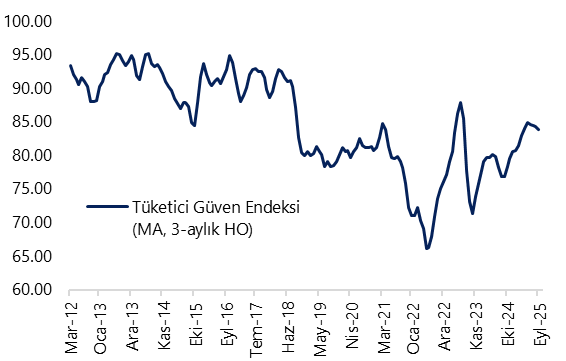 - Tüketici güven endeksi eylül ayında 84,3 seviyesinden 83,9 seviyesine inerken, üç aylık ortalamalara baktığımızda ise endeks seviyesinin ikinci çeyrekte ortalama 84,6 seviyesinde oluşmasının ardından üçüncü çeyrekte ortalama 83,9’a indiği takip ediliyor. Bu noktada, 0 ile 200 arasında değer alabilen tüketici güven endeksinin 100’den küçük olmasının tüketici güveninde kötümser durumu, 100’den büyük olmasının ise tüketici güveninde iyimser durumu yansıttığının altını çizmek isteriz. Eylül verisinin alt kalemlerine baktığımızda: Mevcut dönemde hanenin maddi durumuna ilişkin endeks eylülde 70 seviyesinden 67,8’e gerilerken, gelecek 12 aylık dönemde hanenin maddi durum beklentisine ilişkin alt endeks 83,8’den 84’e sınırlı bir artış gösterdi. Gelecek 12 aylık dönemde genel ekonomik durum beklentisi endeksi 78,4’ten 78’e inerken, iç talep görünümüne yönelik önemli bir kalem olan gelecek 12 aylık dönemde dayanıklı tüketim mallarına harcama yapma düşüncesi endeksi ise 104,8 seviyesinden 105,7’ye çıktı. Nisan ayından bu yana 84 – 85 bandında görece yatay bir seyir izlemekte olan tüketici güven endeksi, tüketici güvenindeki kötümser durumun devam ettiğine işaret ediyor.