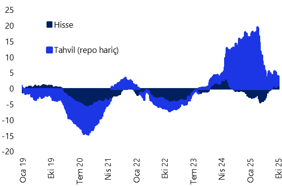 - 3 – 10 Ekim haftasında yabancı yatırımcılar hisse senedi piyasasında 109,7 milyon dolarlık net satış gerçekleştirirken, tahvil piyasasında ise (repo işlemleri hariç) 307,8 milyon dolar tutarında net yabancı girişi yaşandı. Yabancı yatırımcının toplam tahvil stoku içerisindeki payı ise %6,8 seviyesinden %6,7 seviyesine geriledi. Bu dönemde, yurt içi yerleşiklerin altın hariç parite etkisinden arındırılmış DTH’ları 99 milyon dolarlık sınırlı bir artış kaydederken, altın dahil toplam DTH hesapları, fiyat etkisinden arındırılmış olarak 1,4 milyar dolar yükseldi. 3 – 10 Ekim haftasında TCMB net döviz rezervi 4 milyar dolar artışla 79,1 milyar dolar, brüt döviz rezervi 3,5 milyar dolar yükselişle 190 milyar dolar ve swap hariç net rezerv ise 2,3 milyar dolar artışla 61,7 milyar dolar oldu. Böylelikle swap harç net rezerv, 19 Mart döneminden bu yana ilk defa 60 milyar doların üzerine çıktı.