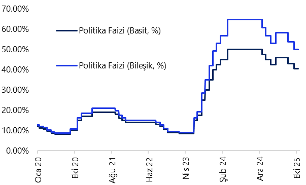 - Beklentilerin üzerinde gerçekleşen eylül ayı enflasyon verilerinin ardından Para Politikası Kurulu’nun (PPK) faiz indirimlerine daha düşük bir hızda devam etmesini bekliyoruz. TCMB Başkanı Karahan’ın 7 Ekim’de TBMM Plan ve Bütçe Komisyonu’nda gerçekleştirdiği sunumdan gelen mesajları da bu minvalde okuyoruz. Bu çerçevede, 23 Ekim tarihli PPK toplantısında politika faizinde 150 baz puanlık indirim beklemekle birlikte, daha küçük bir indirim ihtimalini de göz ardı etmiyoruz. Yıl sonu politika faizi tahminimiz %37,5 seviyesinde bulunmakla birlikte, tahminimize yönelik risklerin yukarı yönlü olduğunu değerlendiriyoruz.