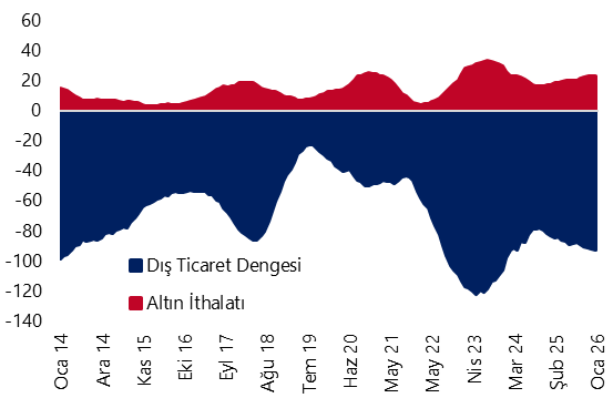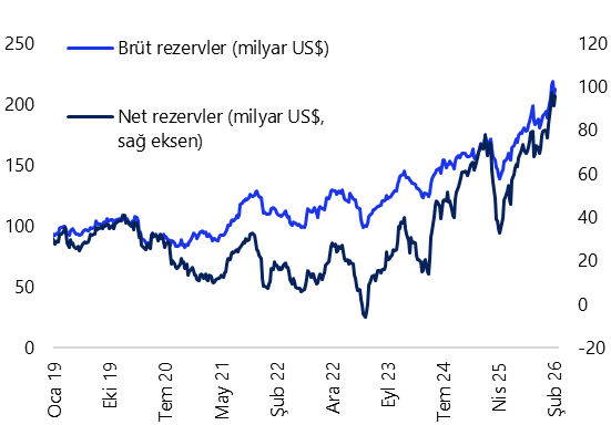 - Öncü dış ticaret verileri çerçevesinde cari işlemler dengesinin, ocak ayında 6,5 milyar dolar açık vermesini bekliyoruz. Ocak ayında ödemeler dengesi tanımlı dış ticaret açığının 7,2 milyar dolara sınırlı bir düşüş kaydetmesini, hizmetler dengesi fazlasının ise 2,7 milyar dolar seviyesinde gerçekleşmesini bekliyoruz. 2026 yıl sonu cari işlemler açığı tahminimiz 30 milyar dolar (GSYİH’nın %1,7’si) seviyesinde bulunmakla birlikte, tahminimize yönelik risklerin yukarı yönlü olduğunu değerlendiriyoruz.