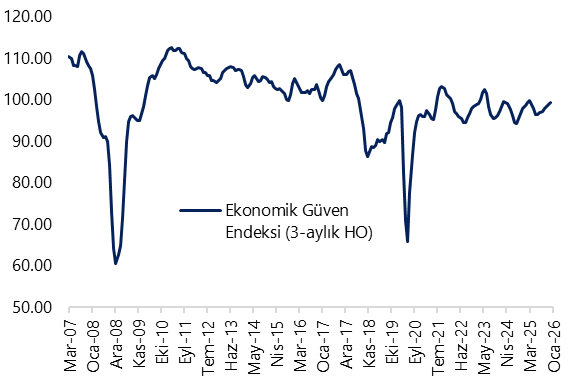 - Ekonomik güven endeksi ocak ayında değişim kaydetmeyerek 99,4 seviyesinde sabit kaldı ve Mart 2025’ten bu yana en yüksek düzeyini korudu. Endeksin 100 eşik değerinin altında kalması, genel ekonomik algının hâlen kötümser bölgede seyrettiğine işaret etse de, temmuz ayından bu yana 96,3’ten 99,4’e seviyesine izlenen yükseliş, algıdaki zayıflamanın ivme kaybettiğini gösteriyor. Ocak verisinin alt kalemleri incelendiğinde, tüketici güven endeksi %0,3 artışla 83,7 seviyesine çıkarken, reel kesim güven endeksi %0,7 düşüşle 103 seviyesine indi. Hizmet sektörü güven endeksi %1,3 oranında artarak 113,8’e çıkarken, perakende ticaret sektörü güven endeksi %2,4 düşüşle 112,6 değerini aldı. İnşaat sektörü güven endeksi ise %1,5 oranında artarak 85,7’e çıktı. Genel çerçevede, ekonomik güven endeksindeki yüksek seviyelerin korunması, yılın ilk ayında ekonomik algıda belirgin bir bozulma olmadığını, ancak iyileşmenin sektörler arasında farklılaşan bir görünüm sergilediğini ortaya koyuyor.