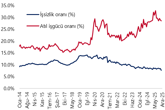 - Mevsim etkisinden arındırılmış işsizlik oranı aralık ayında %8,5 seviyesinden %7,7’ye hızlı bir düşüş kaydederek rekor düşük seviyeye gerilerken, işgücü istatistikleri içerisinde yakından izlediğimiz ve daha geniş tanımlı bir işsizlik göstergesi olan âtıl işgücü oranı (zamana bağlı eksik istihdam, potansiyel işgücü ve işsizlerden oluşan geniş tanımlı işsizlik oranı) ise bu dönemde %28,9’dan %28,6’ya sınırlı bir gerileme kaydetti. Alt kırılımlara baktığımızda, zamana bağlı eksik istihdam ve işsizlerin bütünleşik oranı %18,6’dan %18,1’e inerken; işsiz ve potansiyel işgücünün bütünleşik oranı %20,1’den %19,5’e geriledi. Geniş tanımlı göstergelerde düşüş görülse de, yüksek seviyelerin korunduğu dikkat çekiyor. İstihdam oranı son üç aydır %49,1 seviyesinde sabit seyrederken, işgücüne katılım oranının ise aralık ayında %53,7’den %53,2’ye indiği takip ediliyor. Manşet işsizlik oranı aralık itibariyle rekor düşük seviyeye inse de, geniş tanımlı işsizlik göstergeleri istihdam piyasasında manşet işsizlik oranının ima ettiğinden daha zayıf bir görünüme işaret ediyor.