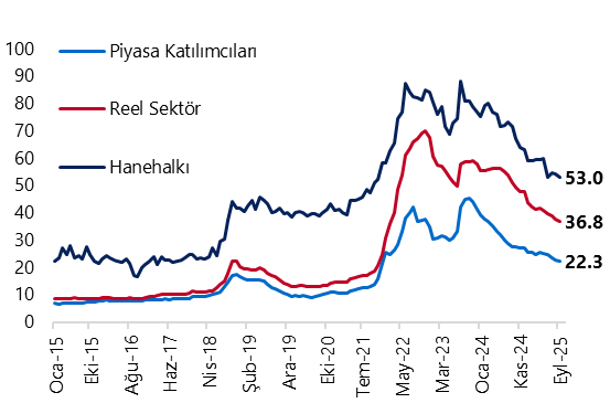 - TCMB’nin ekim ayına ilişkin yayınlanan Sektörel Enflasyon Beklentileri Anketi’ne göre, 12 ay sonrasına ilişkin yıllık enflasyon beklentileri bir önceki aya göre; piyasa katılımcıları için 1,01 puan artarak %23,26 seviyesine, hanehalkı için 1,40 puan artarak %54,39 seviyesine yükselirken, reel sektör için 0,50 puan azalarak %36,30 seviyesine geriledi. Beklentilerin üzerinde gelen eylül ayı enflasyon verilerinin ardından piyasa katılımcıları ve hanehalkı beklentileri bozulurken, reel sektörün 12 ay sonrasına ilişkin enflasyon beklentisinde sınırlı da olsa düşüş kaydedildiği izleniyor. Dolayısıyla, ekonomik birimlerin enflasyon görünümüne dair algılarında kalıcı bir iyileşme sinyali görünmüyor. Kasım ayına ilişkin enflasyon verileri 3 Aralık Çarşamba günü saat 10:00’da açıklanacak. Kurum olarak kasım ayı aylık TÜFE artışının %1,34 seviyesinde oluşmasını bekliyoruz. Beklentimize paralel bir gerçekleşme olması durumunda yıllık TÜFE %32,9’dan %31,7’ye gerileyecek. 2025 yıl sonu TÜFE tahminimiz ise %31,5, 2026 yıl sonu TÜFE tahminimiz ise %23 seviyesinde.