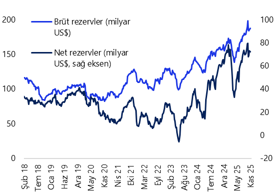 - Ticaret Bakanlığı tarafından açıklanan ekim ayı öncü verileri, dış ticaret açığında yükselişe işaret ediyor. Ekim öncü verilerine göre ihracat yıllık bazda %2,3 artışla 24 milyar dolar, ithalat ise %6,6 yükselişle 31,4 milyar dolar olarak gerçekleşti. Öncü veriler çerçevesinde dış ticaret açığı ekim ayında, eylül ayındaki 6,9 milyar dolar düzeyinden 7,4 milyar dolara yükseldiğini, yıllık açığın ise 89,2 milyar dolardan 90,6 milyar dolara çıktığını takip ediyoruz. Bununla birlikte cari işlemler dengesinin ekim ayında 1 milyar dolar civarında fazla vereceğini tahmin ediyoruz. Cari açığın 2025 yıl sonunda 18 milyar dolar (GSYİH’nın %1,1’i) civarında oluşabileceğini değerlendiriyoruz. 2026 yıl sonu cari açık tahminimiz ise 25 milyar dolar (GSYİH’nın %1,5’i) seviyesinde.