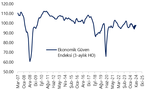 - Ekonomik güven endeksi, Ekim ayında %0,3 oranında sınırlı bir artışla 98,2 seviyesinde gerçekleşirken, 100 eşik değerin altında kalmaya devam etti. Mart ayından bu yana 100 seviyesinin altında seyreden endeks, genel ekonomik duruma ilişkin algının kötümser tarafta kalmayı sürdürdüğüne işaret ediyor. Üç aylık ortalamada ise endeksin ekimde 97,4’ten 98’e yükseldiği görülüyor. Ekim verisinin alt detaylarına bakıldığında; tüketici güven endeksi %0,3 düşüşle 83,6’ya, hizmet sektörü güven endeksi %0,3 azalışla 110,7’ye ve inşaat sektörü güven endeksi %5,3 düşüşle 83,7’ye gerilerken; reel kesim güven endeksi %1,2 artışla 102’ye, perakende ticaret sektörü güven endeksi ise %3,7 yükselişle 113,2’ye ulaştı.