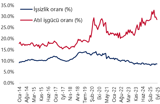 - Mevsim etkisinden arındırılmış işsizlik oranı eylül ayında %8,6 seviyesinde sabit kaldı. Bu dönemde işgücü 188.000 kişi azalarak 35,6 milyona inerken, işgücü içerisinde istihdam edilenlerin sayısı ise 200.000 kişilik düşüşle 32,5 milyon oldu. İşsiz kişi sayısı 12.000 kişi artarak 3,1 milyon olurken, İşgücüne katılım oranı ise %53,8’den %53,5’e indi. İşgücü istatistikleri içerisinde yakından izlediğimiz ve daha geniş tanımlı bir işsizlik göstergesi olan âtıl işgücü oranı (zamana bağlı eksik istihdam, potansiyel işgücü ve işsizlerden oluşan geniş tanımlı işsizlik oranı) ise bu dönemde %29,8’den %28,6’ya indi. Atıl işgücü oranının detaylarına baktığımızda: Eylül ayı itibariyle zamana bağlı eksik istihdam ve işsizlerin bütünleşik oranı %19,4’den %18’e inerken, işsiz ve potansiyel işgücünün bütünleşik oranı ise %20,3 seviyesinden %20,5’e çıktı. Atıl işgücü oranındaki bu düşüşte, zamana bağlı eksik istihdam ve işsizlerin bütünleşik oranındaki gerileme etkili olmuş görünüyor. Ancak, geniş tanımlı işsizlik göstergesi olan atıl işgücü oranı eylülde gerilese de, hâlen %28’in üzerinde seyrederek istihdam piyasasında manşet verinin ima ettiğinden daha zayıf bir görünüme işaret ediyor. İstihdam sektörüne yönelik öncü göstergelerin de zayıf sinyaller üretmeye devam ettiği görülüyor. İmalat PMI verisinde istihdama ilişkin alt kalemler, Kapasite Kullanım Oranı ve önümüzdeki 12 aylık sürece ilişkin işsiz kişi sayısına yönelik beklentiler, yakın dönem işsizlik oranı ile ilgili olumsuz bir görünüm çiziyor.