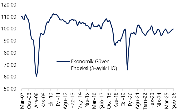 - Ekonomik güven endeksi şubat ayında 99,4 seviyesinden 100,7 seviyesine yükselerek Mart 2025’ten bu yana ilk kez 100 eşik değerinin üzerine çıktı. Endeksin 100 seviyesinin üzerinde gerçekleşmesi, genel ekonomik görünüme ilişkin algının yeniden iyimser bölgeye geçtiğine işaret ediyor. Şubat verisinin alt kalemleri incelendiğinde; tüketici güven endeksi %2,3 artışla 85,7’ye, reel kesim güven endeksi %1,1 artışla 104,1’e, perakende ticaret sektörü güven endeksi %2,9 artışla 115,9’a yükselirken; hizmet sektörü güven endeksi 113,8 seviyesinde yatay seyretti. Buna karşılık inşaat sektörü güven endeksi %2,1 azalışla 83,9’a geriledi. Güven endekslerinde şubat ayında toparlanma ekonomik aktivitede dipten dönüşe işaret etse de, ABD–İran geriliminin yarattığı belirsizlikler bu iyileşmenin kalıcılığına ilişkin riskleri canlı tutuyor. Bu çerçevede, endeks seviyesinin yakın vadede yeniden 100 eşik değerinin altına gerileyebileceğini değerlendiriyoruz.