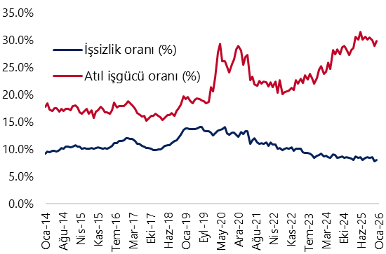 - Mevsim etkisinden arındırılmış işsizlik oranı ocak ayında %7,8’den %8,1’e yükselirken, işgücü istatistikleri içerisinde yakından izlediğimiz ve daha geniş tanımlı bir işsizlik göstergesi olan âtıl işgücü oranı (zamana bağlı eksik istihdam, potansiyel işgücü ve işsizlerden oluşan geniş tanımlı işsizlik oranı) ise bu dönemde %29’dan %29,9’a çıktı. Alt kırılımlara baktığımızda, zamana bağlı eksik istihdam ve işsizlerin bütünleşik oranı %18,5 seviyesinden %19,2’ye, işsiz ve potansiyel işgücünün bütünleşik oranı ise %19,7’den %20,2’ye yükseldi. İstihdam oranı bu dönemde %48,7’den %47,9’a inerken, işgücüne katılım oranı ise %52,9’dan %52,1’e geriledi. Geniş tanımlı işsizlik oranında %30 civarında izlenen seviyeler, istihdam piyasasında manşet işsizlik oranının ima ettiğinden daha zayıf bir görünüme işaret ediyor. ABD - İran arasındaki gerilimin ekonomik faaliyet üzerinde yaratmasını beklediğimiz aşağı yönlü etkisiyle birlikte, geniş tanımlı işsizlik göstergelerindeki yükseliş eğiliminin önümüzdeki dönemde de devam edebileceğini değerlendiriyoruz.