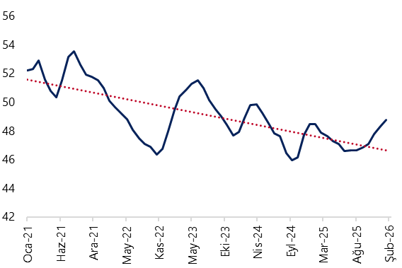 - İstanbul Sanayi Odası (İSO) Türkiye İmalat PMI, şubat ayında 48,1 seviyesinden 49,3’e yükselerek Nisan 2024’ten bu yana en yüksek değerine ulaştı. İSO tarafından açıklanan notta, müşteri talebinde görülen iyileşme sinyallerine bağlı olarak yeni siparişlerdeki düşüşün yaklaşık son iki yılın en ılımlı düzeyinde kaydedildiği vurgulanırken; üretim, istihdam ve stoklardaki düşüşlerin ise ocak ayına göre daha hafif seyrettiği ifade edildi. Güven endeksleri ve PMI verilerinde son dönemde izlenen ılımlı iyileşme sinyallerinin, ABD – İran gerilimi çerçevesinde mart ayı itibariyle yerini yeniden bozulmaya bırakmasını bekliyoruz. ABD–İran savaşının ekonomik faaliyet üzerindeki olumsuz etkileri nedeniyle, 2026 yılına ilişkin %4 seviyesindeki büyüme tahminimiz üzerinde belirgin aşağı yönlü riskler oluşmuş durumda. TCMB’nin efektif 300 baz puanlık faiz artırımı sonrasında faiz indirimlerinin bu yıl daha gecikmeli ve sınırlı ilerleyeceği beklentimizle, 2026 sonunda büyümenin %3,4 civarında gerçekleşebileceğini düşünüyoruz. Arz şokunun süresi ve gelişmekte olan ülke piyasalarından çıkışların büyüklüğüne bağlı olarak büyüme üzerindeki aşağı yönlü risklerin daha da belirginleşmesi mümkün.