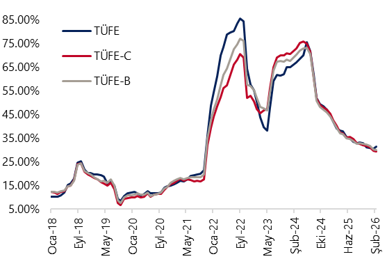 - Mart ayı aylık TÜFE artışının %2,1 seviyesinde gerçekleşmesini bekliyoruz. Tahminimize yönelik riskleri yukarı yönlü görmekle birlikte, beklentimize paralel bir gerçekleşme durumunda yıllık TÜFE’nin %31,5 seviyesinden %31,1’e sınırlı bir gerileme kaydedeceğini hesaplıyoruz. ABD – İran savaşıyla birlikte yükselen küresel enerji fiyatlarına rağmen, devreye alınan %75’lik eşel mobil sistemi sayesinde akaryakıt fiyat artışlarının mart enflasyonu üzerindeki etkisi bu aşamada sınırlı kaldı. Ancak eşel mobil sisteminin sınırına yaklaşılmış olması ve petrol fiyatlarının varil başına 100$ üzerinde kalmaya devam etmesi durumunda, nisan ayında enerji geçişkenliğinin daha belirgin hale gelmesi beklenebilir. Bunun yanında başta LNG olmak üzere enerji fiyatlarındaki artışın üretici fiyatları kanalıyla genel fiyat seviyesi üzerinde yukarı yönlü baskı oluşturmasını bekliyoruz. Ayrıca üre fiyatları kaynaklı maliyet baskılarının önümüzdeki dönemde gıda enflasyonu açısından da risk oluşturduğunu düşünüyoruz. Bu gelişmeler, yıl sonu enflasyonunun daha önceki tahminimizin (%23) belirgin şekilde üzerine çıkarak %26 civarına yönelebileceğine işaret ediyor.