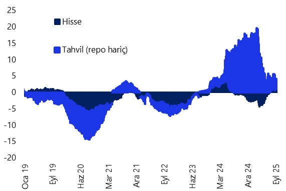- 19 – 26 Eylül haftasında yabancı yatırımcılar hisse senedi piyasasında 158,8 milyon dolar, tahvil piyasasında ise (repo işlemleri hariç) 415,7 milyon dolar net alım gerçekleştirdi. Yabancı yatırımcının toplam tahvil stoku içerisindeki payı ise %6,6’dan %6,8’e yükseldi. Bu dönemde, yurt içi yerleşiklerin altın hariç parite etkisinden arındırılmış DTH’ları 1,8 milyar dolar, altın dahil toplam DTH hesapları ise fiyat etkisinden arındırılmış olarak 1,3 milyar dolar geriledi. 19 – 26 Eylül haftasında TCMB net döviz rezervi 2,3 milyar dolar artışla 72,7 milyar dolar, brüt döviz rezervi ise 4,1 milyar dolar yükselişle 183,1 milyar dolar oldu. Swap stoku bu dönemde 1,7 milyar dolar gerileyerek 15,6 milyar dolara inerken, swap hariç net rezerv ise 4,1 milyar dolar artışla 57,1 milyar dolar oldu. Ayrıntılı rapor için tıklayınız.
