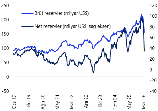 - Yabancı yatırımcılar 20 – 27 Mart haftasında hisse senedi piyasasında 137,1 milyon dolar net alım gerçekleştirirken, tahvil piyasasında repo işlemleri hariç 1,4 milyar dolar net satış yaptı. ABD – İran savaşının başladığı 27 Şubat – 6 Mart haftasından bu yana hisse piyasasında üst üste üç hafta net satış yapan yabancıların, bu dönemde sınırlı da olsa yeniden alıma geçtiği görülüyor. Diğer yandan tahvil piyasasında yabancı çıkışı üst üste altıncı haftada da devam ederken, bu dönemde kümülatif çıkış (repo hariç) 7,3 milyar dolara ulaştı. 20 – 27 Mart haftasında yabancıların toplam tahvil stoku içindeki payı ise %6,7’den %6,1’e geriledi. Bu dönemde yurt içi yerleşiklerin altın hariç parite etkisinden arındırılmış DTH’ları 178 milyon dolar gerilerken, altın dahil toplam DTH hesapları ise fiyat etkisinden arındırılmış olarak 2,2 milyar dolar artış kaydetti. 20 – 27 Mart haftasında TCMB brüt döviz rezervi 22,1 milyar dolar azalarak 155,4 milyar dolara, net döviz rezervi 22,3 milyar dolar düşüşle 35 milyar dolara ve swap hariç net rezerv 22,8 milyar dolar gerileyerek 20,1 milyar dolara indi. Ayrıntılı rapor için tıklayınız.