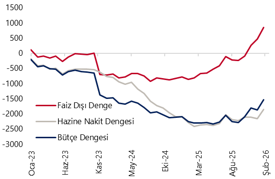- Hazine nakit dengesi şubat ayında 92,4 milyar TL açık verirken, faiz dışı denge ise 90,9 milyar TL fazla kaydetti. Böylelikle yılın ilk iki ayındaki kümülatif nakit açığı 338,7 milyar TL düzeyinde oluştu. Merkezi yönetim bütçesi ise şubat ayında 24,4 milyar TL, faiz dışı denge ise 208,1 milyar TL fazla verdi. Böylece merkezi yönetim bütçesi yılın ilk iki ayında kümülatif olarak 190,2 milyar TL açık verirken, 12 aylık kümülatif bütçe açığı 1,9 trilyon TL’den 1,5 trilyon TL’ye geriledi. Faiz dışı denge yılın ilk iki ayında 450 milyar TL fazla kaydederken, 12 aylık faiz dışı fazla ise 473,4 milyar TL’den 851,8 milyar TL’ye yükseldi. 7 Nisan Salı günü açıklanacak olan mart Hazine nakit dengesi verileri, 15 Nisan’da açıklanacak olan mart merkezi yönetim bütçe dengesi için öncü niteliğinde. Mevcut fiyat ayarlamaları, eşel mobil sistemi kapsamında kullanılabilecek vergi alanının önemli ölçüde daraldığına işaret ediyor. Brent petrolün varil fiyatının 100 dolar üzerinde kalıcılık kazanması halinde, eşel mobil kapsamında kullanılabilecek vergi alanının gelecek ilk fiyat artışıyla tükenmesi ve sonraki akaryakıt zamlarının pompaya tam yansımaya başlaması beklenebilir. Sistemin absorbe edebileceği alanın tamamının kullanılması, yani motorinde litre başına 13,9 TL, benzinde ise 14,82 TL’lik ÖTV alanının tamamen devreye girmesi halinde, uygulamanın bütçeye günlük maliyetinin KDV etkisi dahil yaklaşık 1,4 milyar TL’ye ulaşabileceğini hesaplıyoruz. Bu nedenle eşel mobil sistemi kısa vadede enflasyon geçişkenliğini yumuşatırken, petrol şokunun kalıcılığı halinde ÖTV tahsilatı ve dolayısıyla nakit dengesi üzerinde aşağı yönlü riskleri artıran bir unsur olarak öne çıkıyor. Mevcut uygulama, bütçe açığının 2026 yılı sonunda önceki tahminimiz olan 2,8 trilyon TL (GSYİH’nın %3,4’ü) seviyesinin belirgin şekilde üzerine çıkarak 3,3 trilyon TL (GSYİH’nın %4’ü) düzeyine genişleyebileceğine işaret ediyor.