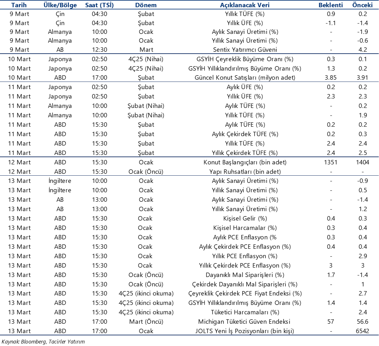 Ekonomik Veri Takvimi 9 – 13 Mart