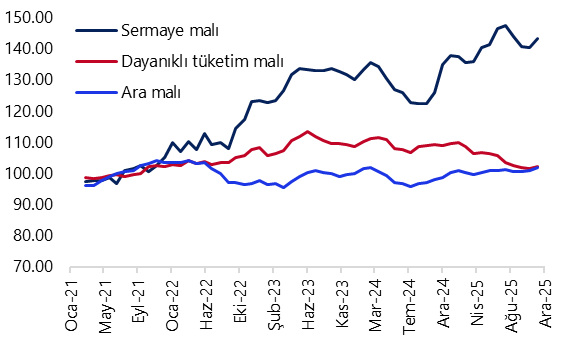 - Mevsim ve takvim etkilerinden arındırılmış sanayi üretimi aralık ayında aylık bazda %1,2 artarken, takvim etkisinden arındırılmış yıllık değişim %2,1 daralmaya işaret etti. Kasım ayında aylık artışın %2,5, yıllık artışın ise %2,2 olduğu dikkate alındığında, sanayi aktivitesinde aralık ayında belirgin bir ivme kaybı izlendiği görülüyor. Alt kalemlere bakıldığında, yıllık daralmada yüksek teknoloji ürünleri (%-25) başta olmak üzere giyim eşyaları imalatı (%-29,2), metal cevheri madenciliği (%-23,4) ve savunma sanayi ürünlerini de içeren diğer ulaşım araçları imalatı (%-9,2) öne çıktı. Özellikle yüksek teknoloji ve diğer ulaşım araçlarında görülen yıllık daralma, bu kalemlerde aylar sonra ilk kez negatif bölgeye geçildiğine işaret ediyor. Aralık verileri ile birlikte sanayi üretimi, 2025 yılının son çeyreğinde yıllık bazda %0,8 büyüme kaydederken (takvim etkisinden arındırılmış yıllık büyüme %0,6), çeyreklik büyüme ise bu dönemde %0,1 ile yataya yakın bir görünüm sergiledi. Hatırlanacağı üzere üçüncü çeyrekte sanayi üretimi yıllık bazda %5,2 büyürken (takvim etkisinden arındırılmış yıllık büyüme %5), çeyreklik bazda %0,6 daralmıştı. 2025 yılında kaydedilen %3,6’lık büyümenin ardından 2026 yılı için %4 büyüme öngörüyoruz.