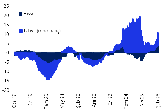 - Yabancı yatırımcılar 20 – 27 Şubat haftasında hisse senedi piyasasında 65,3 milyon dolarlık sınırlı bir alım gerçekleştirirken, tahvil piyasasında repo işlemleri hariç 212,8 milyon dolarlık net satış yaptı. Bu dönemde, yurt içi yerleşiklerin altın hariç parite etkisinden arındırılmış DTH’ları 1,1 milyar dolar, altın dahil toplam DTH hesapları ise fiyat etkisinden arındırılmış olarak 2,1 milyar dolar artış kaydetti. TCMB net döviz rezervi 2,6 milyar dolar artarak 91,6 milyar dolara, brüt döviz rezervi ise 4,2 milyar dolar yükselişle 210,4 milyar dolara çıktı. Ayrıntılı rapor için tıklayınız.