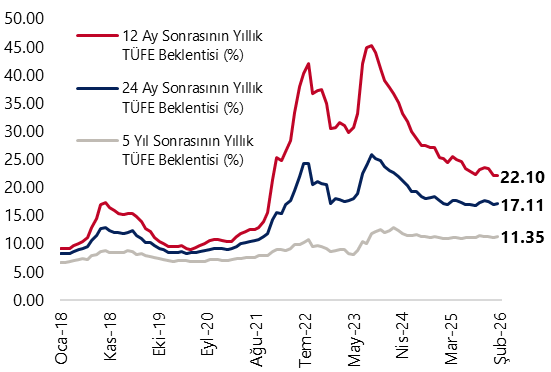 - TCMB’nin Şubat 2026 dönemine ilişkin Piyasa Katılımcıları Anketi sonuçlarına göre, katılımcıların 2026 yıl sonu TÜFE beklentisi %23,2’den %24,1’e yükselirken, 2027 yıl sonu TÜFE beklentisi de %17,8’den %18,4’e çıktı. Ayrıca, 24 ay sonrasına ilişkin TÜFE beklentisi %16,9’dan %17,1’e, 5 yıl sonrasına ilişkin yıllık TÜFE beklentisi ise %11,1’den %11,4’e yükseldi. ABD–İran geriliminin küresel enerji fiyatları üzerinde yarattığı sert yükselişin ardından, mart ayına ilişkin yayımlanacak olan ankette piyasa katılımcılarının yıl sonu cari açık ve enflasyon tahminlerinde yukarı yönlü revizyonlar görmeyi bekliyoruz. Bunun yanında, TCMB’nin attığı proaktif adımlar ve mart toplantısına ilişkin faiz indirimi beklentilerinin zayıflaması doğrultusunda, yıl sonu politika faizi tahminlerinde de yükseliş öngörüyoruz. Kurum olarak yıl sonu politika faizi tahminimizi %29,5 seviyesinde korurken, yıl sonuna ilişkin %23 düzeyindeki enflasyon tahminimize yönelik yukarı yönlü risklerin belirgin şekilde arttığını düşünüyoruz.