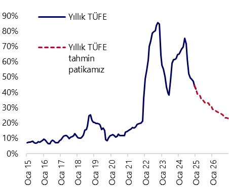 Ocak ayında aylık TÜFE artışının %3,5 civarında şekillenmesini bekliyoruz. Geçtiğimiz yılın aynı ayında aylık enflasyonun %5 gibi yüksek bir seviyede kaydedilmiş olması, baz etkisi kanalıyla bu yılki ocak gerçekleşmesinin yıllık enflasyonu %29 seviyesine doğru çekebileceğine işaret ediyor. Bununla birlikte, ayın henüz başında olmamız nedeniyle yönetilen/yönlendirilen fiyatlar, vergi ayarlamaları ve gıda fiyatları tahmin açısından yakından izleniyor ve bu kalemlerdeki gelişmelere bağlı olarak ocak ayı enflasyon beklentimiz ilerleyen haftalarda revize edilebilir. Orta vadede ise, dezenflasyonun ilk aşamasında sağlanan iyileşmenin ardından, gıda ve konut gibi ataleti yüksek kalemlerdeki yapışkan fiyat davranışı ile hizmet enflasyonundaki katılık, sürecin daha sınırlı hızlarla ilerleyebileceğine işaret ediyor. Bu çerçevede yıllık TÜFE’nin 2026 sonunda %23 civarında oluşmasını bekliyoruz.