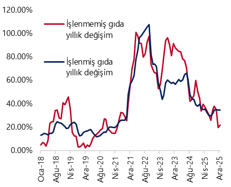 Aralık ayında aylık en yüksek artış %2,9 ile haberleşme kaleminde gerçekleşti. Bu kalemi %2’ye yakın aylık artışlar ile gıda ve alkolsüz içecekler ile sağlık kalemleri takip etti. Gıda enflasyonunun alt kalemlerini incelediğimizde, İşlenmemiş gıda fiyatları aylık bazda %2,6 artarken, yıllık artış %19,4’ten %21,5’e yükseldi. Aralık ayında taze meyve ve sebze fiyatları aylık %0,1 gerilerken, diğer işlenmemiş gıda tarafında ise %4,4 yükseliş yaşandı. İşlenmiş gıdada ise aralık ayında %1,5 artış yaşanırken, bu cephedeki yıllık artış %34,6’dan %34,3’e sınırlı bir gerileme gösterdi. Temel mal enflasyonu ise kasım ayındaki aylık %0,9’luk artışın ardından aralık ayında %0,3’e gerilerken, buradaki yıllık artış ise %18,6’dan %17,7’ye indi. İç talebe yönelik önemli bir gösterge niteliğinde olan dayanıklı tüketim mallarında ise aylık artışın aralık ayında %1’den %0,7’ye gerilerken, buradaki yıllık artış ise %22,9’dan %21,8’e geriledi. Giyim ve ayakkabı kalemi ise, mevsimsel etkiler kaynaklı olarak aralık ayında aylık %3,1’e yakın düşüş kaydederek, mal enflasyonundaki belirgin gerilemede etkili oldu.