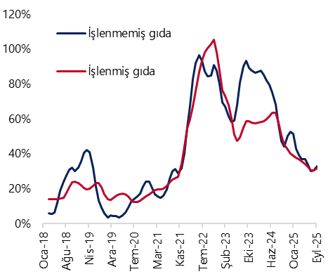 Eylül ayında kurum beklentimiz ve TÜFE gerçekleşmesi arasındaki fark büyük ölçüde gıda fiyatlarından kaynaklandı. Eylülde aylık bazda en yüksek artış %17,9 ile eğitim kaleminde oluşurken, bu kalemi %4,6 ile gıda ve %3,9 ile giyim kalemleri takip etti. Mevsimselliğin etkisi ile birlikte eylülde eğitim ve giyim kalemlerinde belirgin artış yaşlanması kurum beklentimiz ve piyasa beklentileri dahilindeydi. Ancak, aylık bazda %4,6 olarak gerçekleşen gıda fiyat artışı, %2,7 olan kurum tahminimizin çok üzerinde yer aldı. Gıda fiyatlarının detayını inceleyecek olursak; işlenmemiş gıda fiyatları aylık %%5,5 oranında güçlü bir artış kaydederken, bu kalem altında taze meyve ve sebze fiyatları aylık %4,3 arttı. İşlenmemiş gıdadaki yıllık artış ise %35 seviyesinden %37,5’e yükseldi. İşlenmiş gıda kaleminde ise eylülde aylık %3,9 artış yaşanırken, bu cephedeki yıllık artış %31,4’ten %34,3’e çıktı.