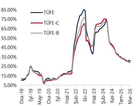 Mart ayı aylık TÜFE artışı %1,94 ile %2,1 olan kurum tahminimizin hafif altında gerçekleşti. Piyasa medyan tahmini %2,3 seviyesindeydi. Böylelikle yıllık TÜFE %31,5’ten 30,9’a geriledi. ÜFE tarafında ise aylık artış %2,3 olurken, yıllık ÜFE artışı %27,6’dan %28,1’e çıktı. Mart verisi, yılın ilk iki ayındaki yüksek gıda artışlarının ardından belirgin bir sönümlenmeye işaret ederken, eşel mobil sistemi sayesinde akaryakıt kaynaklı geçişkenliğin sınırlı kaldığını ortaya koyuyor. Ancak, enerji fiyatlarındaki yükselişle birlikte risk dengesi yukarı kaymış durumda.
