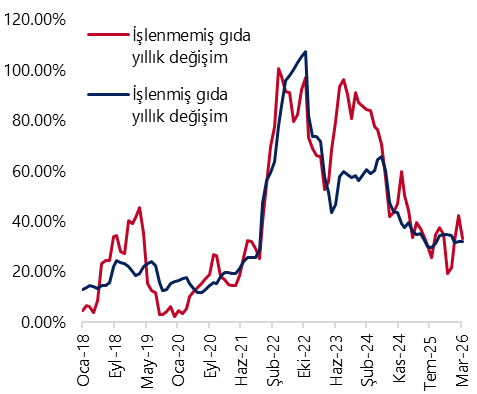 Ocak ve şubat aylarında aylık bazda %6’nın üzerinde artış kaydeden gıda ve alkolsüz içecekler kaleminde, mart ayında beklediğimiz düzeltme gerçekleşti ve aylık artış %1,8’e geriledi. Gıda alt kalemlerine baktığımızda, işlenmemiş gıda fiyatları, şubattaki %9’luk aylık artış sonrasında mart ayında aylık %3,2 yükseldi. İşlenmemiş gıda fiyatlarındaki bu düşüşte, taze meyve sebze fiyatlarındaki artışın şubat ayındaki %17,6 seviyesinden %3,1’e inmesi etkili oldu. İşlenmiş gıda fiyatları ise şubatta aylık %5,2 artış kaydetmesi sonrasında mart ayında %0,6 yükselerek önemli bir sönümlenme kaydetti. Yıllık artışlar ise işlenmemiş gıdada %42,3’ten %33,3’e inerken, işlenmiş gıdada %32,1’de yatay kaldı. Gıda kalemindeki yıllık artış ise %36,5’ten %33,4’e geriledi.