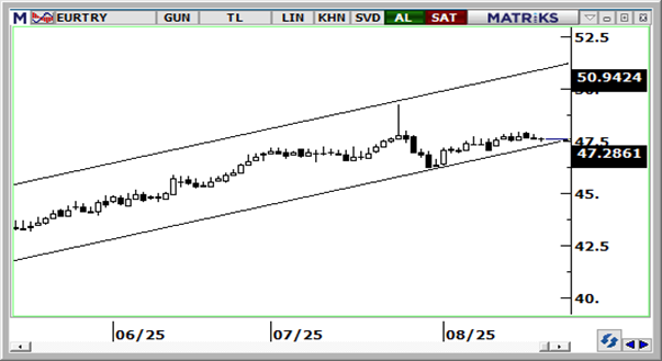 Bu sabah itibariyle 47,63 üzerinde işlem görmekte olan EURTRY’de, teknik göstergeler kısa vadede 47,50 altında kalıcı bir düşüş ihtimalinin zor olduğuna işaret ediyor. Göstergeler, EURTRY’de kısa vade için 47,50 – 48,50 bandında bir hareket ihtimalini destekliyor. Kademeli yükseliş eğiliminin korunduğu kurda, eurodaki kısmi geri çekilmelerin yarattığı baskıların sınırlı kalmasını bekliyoruz. Tarihi zirve seviyelere yakın işlem görmekte olan EURTRY’de, 47,62 47,35 ve 47,20 seviyeleri destek olarak izlenecek.