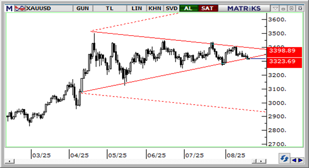 Teknik göstergeler, bu sabah test edilen 3.315$ desteğinden yönün yeniden yukarı dönebileceğine işaret ediyor. Altının 3.315$ seviyesinden destek bulması halinde yakın vadede 3.350$ seviyesine doğru tepki alımları oluşabileceğini değerlendiriyoruz. Günlük grafikte oluşan bayrak formasyonu, altının yakın vadede 3.300$ – 3.400$ bandında seyredebileceğine, sonrasında ise yükselişini 3.500$ üzerine taşıyabileceğine işaret ediyor. Altında 3.315$, 3.285$ ve 3.250$ seviyeleri destek, 3.350$, 3.385$ ve 3.415$ seviyeleri ise direnç konumunda yer alıyor.