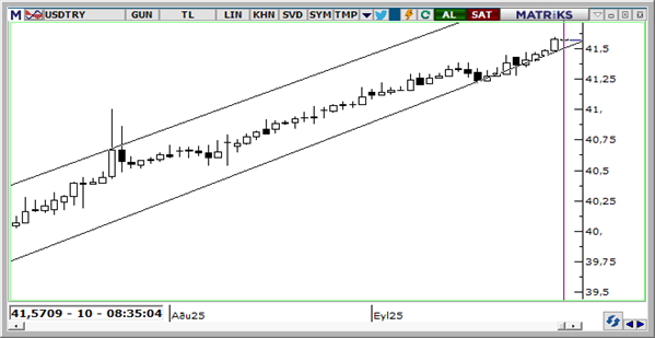USDTRY’de süregelen yukarı yönlü ivme, günlük grafikte devam eden yükseliş kanalıyla desteklenirken, kısa vadede 41,20 – 42 bandında bir fiyatlama eğiliminin öne çıktığı görülüyor. Teknik görünüm, kademeli yukarı yönlü trendin devam ettiğine işaret ederken, 41,20 seviyesinin altına doğru kalıcı bir geri çekilmenin zorlaştığını ortaya koyuyor. USDTRY’de 41,18, 41,10 ve 41,06 seviyeleri yakın vadeli destek konumunda yer alıyor.