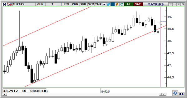 Parite 46,5 – 49,25 bandındaki hareketini sürdürürken, 48,50 seviyesinin altına doğru gelebilecek olası geri çekilmelerin kalıcı olmayacağı; bu seviyenin altındaki muhtemel düşüşlerde ise 48,20 civarında konumlanan en yakın destekten güçlü bir toparlanma potansiyelinin sürdüğü yönündeki beklentimiz korunuyor. Trend ve momentum göstergeleri, kısa vadede fiyatın 48 – 49,50 aralığında dalgalanmayı sürdürebileceğine işaret ediyor. Kurda kademeli yükseliş eğiliminin devamını bekliyoruz. EURTRY’de 48,20 ve 48,15 seviyeleri destek, ve 49,20 seviyesi ise direnç konumunda yer alıyor.