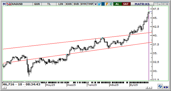 Gümüşte yükseliş eğilimi devam ederken, trend ve momentum indikatörleri yakın vadede 44 $ üzerindeki hareketin korunabileceğini gösteriyor. Fiyat 46 $ direncini aşıp, aynı seviyeyi destek olarak kullandı ve yukarı yönlü hareketine devam ediyor. Destek bölgeleri: 46,00 $ ve 45,00 $; Direnç bölgesi ise 47,50 $ olarak görülmekte.