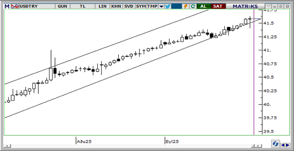 USDTRY’de devam eden yükseliş eğilimi, günlük grafikte izlenen yukarı yönlü kanal ile teyit edilirken, kısa vadede 41,20 – 42 bandında fiyat hareketlerinin öne çıktığı görülüyor. Teknik görünüm, kademeli olarak süren yükseliş trendine işaret ederken, 41,20 seviyesinin altına kalıcı bir geri çekilmenin gerçekleşmesinin güç olduğunu gösteriyor. USDTRY’de 41,18, 41,10 ve 41,06 seviyeleri yakın vadeli destek konumunda yer alıyor.