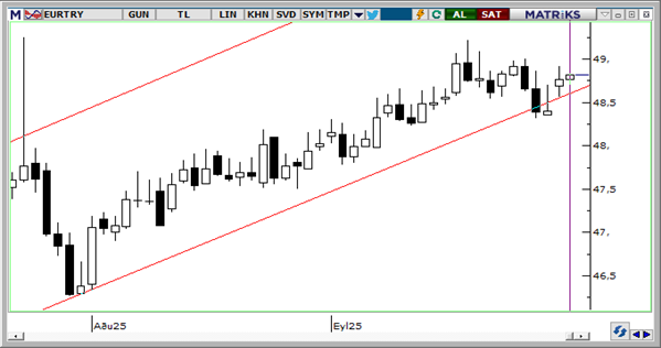 Parite 46,5 – 49,25 bandındaki seyrini korurken, 48,50 seviyesinin altına yaşanabilecek olası geri çekilmelerin kalıcı olmayacağı; bu seviyenin altındaki muhtemel düşüşlerde ise 48,20 seviyesinde bulunan en yakın destekten güçlü bir toparlanma ihtimalinin devam ettiği görüşümüz sürüyor. Trend ve momentum göstergeleri, kısa vadede fiyatın 48 – 49,50 aralığında dalgalanma eğilimini sürdürebileceğini gösteriyor. Kurda kademeli yükseliş eğiliminin devamını bekliyoruz. EURTRY’de 48,20 ve 48,15 seviyeleri destek, ve 49,20 seviyesi ise direnç konumunda yer alıyor.