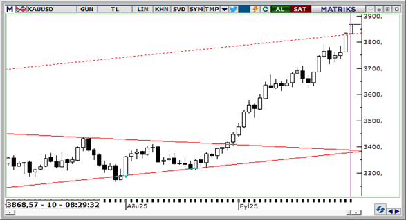 Altın için orta-uzun vadeli görünümümüzde beklentimiz yukarı yönlü olmaya devam ediyor. Olası düzeltmeler açısından ise günlük grafikteki formasyonunun hedef aralığı olan 3.875 – 3.900 bandı izlenebilir. Aşağıda ise 3.775$, 3.730$ ve 3.700$ seviyeleri kısa vadeli destek konumunda. Bu kapsamda, geri çekilmeleri bir alım fırsatı olarak görüp, sınırlı kalmasını bekliyoruz. Direnç olarak ise 3.875$ – 3.900$ takip edilebilir.